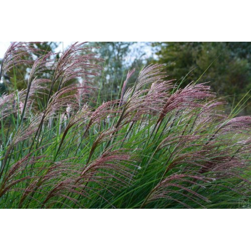 Miskant ’Sioux’ to piękna odmiana miskanta o niskim wzroście i charakterystycznym ulistnieniu. Roślina dorasta do około 80 cm wysokości, a łącznie z kwiatostanami może sięgać około 110 cm, tworząc gęste, rozwarte kępy. Początkowo przybiera jesienną barwę, ma pomarańczowoczerwone liście. Podczas kwitnienia możemy zauważyć delikatne ciemnoczerwone kwiatostany w postaci miotełek, które z czasem przebarwiają się w srebrzysto białe. Miskant uwielbia stanowisko półsłoneczne, w pełnym słońcu też poradzi sobie dobrze, ale liście mogą zostać przypalone przez promienie słoneczne. Preferuję żyzną oraz wilgotną glebę. W pierwszych dwóch latach po posadzeniu najlepiej okryć go przed zimą przysypując nasadę pędów warstwą kory. Zalecamy przycinanie suchych, zeszłorocznych liści, w celu nabrania gęstości sadzonki. Pięknie prezentuje się na rabatach ogrodowych, skalniakach, w ogrodach przydomowych oraz parkach.